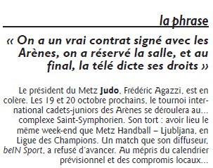 Nombreux sont les sportifs lorrains qui se posent des questions suite à la brève parue dans le Républicain Lorrain du 27 septembre 2013 à propos du déménagement du Tournoi Metz-Moselle à Saint-Symphorien (voir ci-contre).